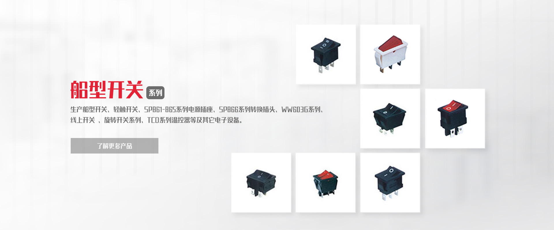 公司專業生產船型開關、輕觸開關、SP861-865系列電源插座、SP866系列轉換插頭、WW11系列微動開關、WW01-03、09系列按鈕開關DS、WW系列指示燈開關、WW603G系列 線上開關 、旋轉開關系列、TCD系列溫控器等及其它電子設備。
